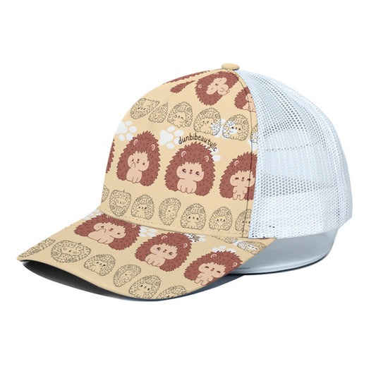 Unisex Peaked Cap With White Half-mesh Hedgehog, Kawaii, Animals, Paw Prints, Happy, Cute, Sleepy, Baby Animals, Brown, White (Designed by Dunbi)