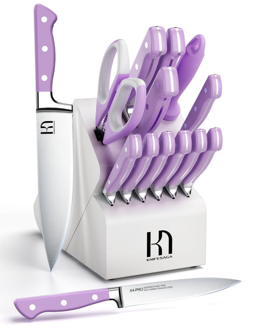 Knife Set, KnifeSaga Purple Kitchen Knife Set 15Pcs, Enduring Razor-Sharp Knife Block Set, High Carbon Stainless Steel Purple Knife Set with Block and sharpener, Premium Forged Knives Set for Kitchen