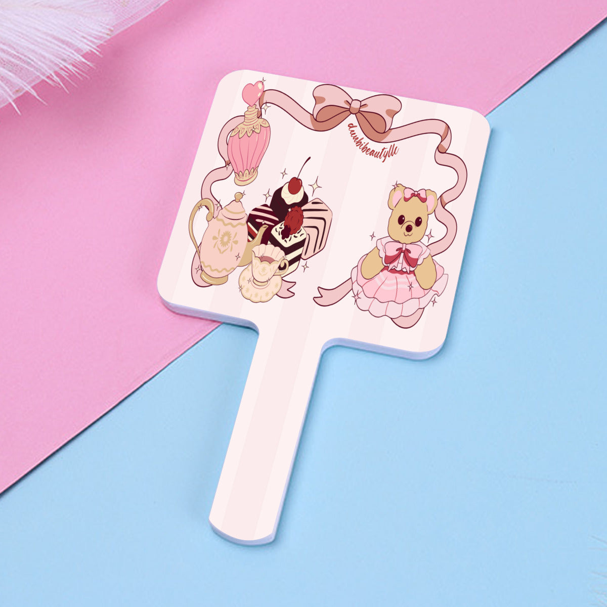Handle Square Mirror|Rubber -Cute Teddy Bear, Tea Party, Ribbon, Bows, Cakes, Cute, Victorian, Doll, Cute Girl, Pink Style 1, Stripes (Designed by Dunbi)
