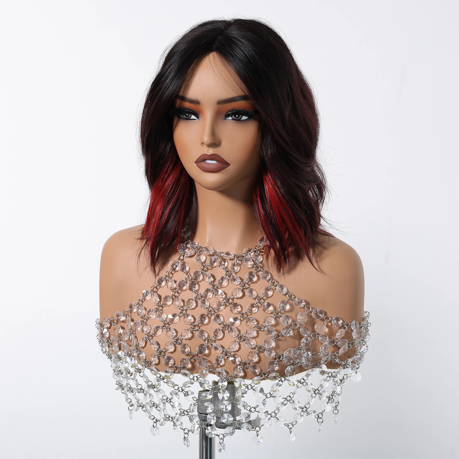 Short Natural Wavy Synthetic Wig 12inch Black Highlight Red Hair Wigs For Women Daily T-part Bob Wig Christmas Party Cosplay Wig