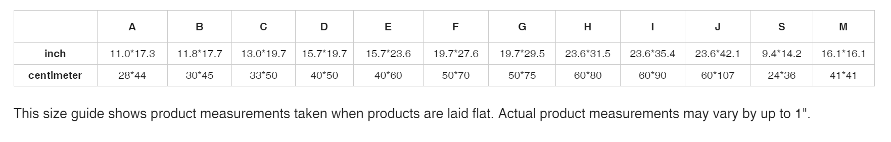 | centimeter | 28*44 | 30*45 | 33*50 | 40*50 | 40*60 | 50*70 | 50*75 | 60*80 | 60*90 | 60*107 | 24*36 | 41*41 |