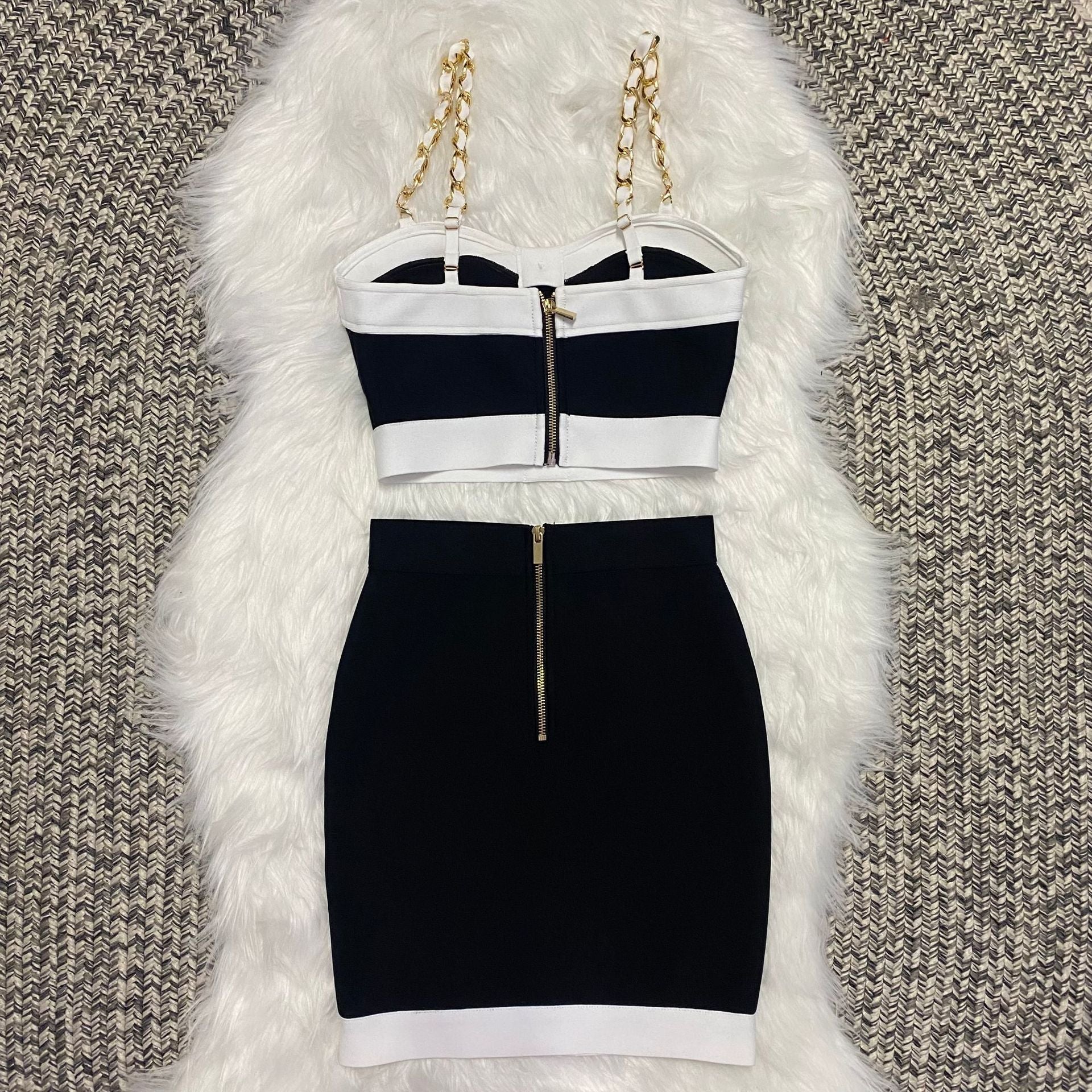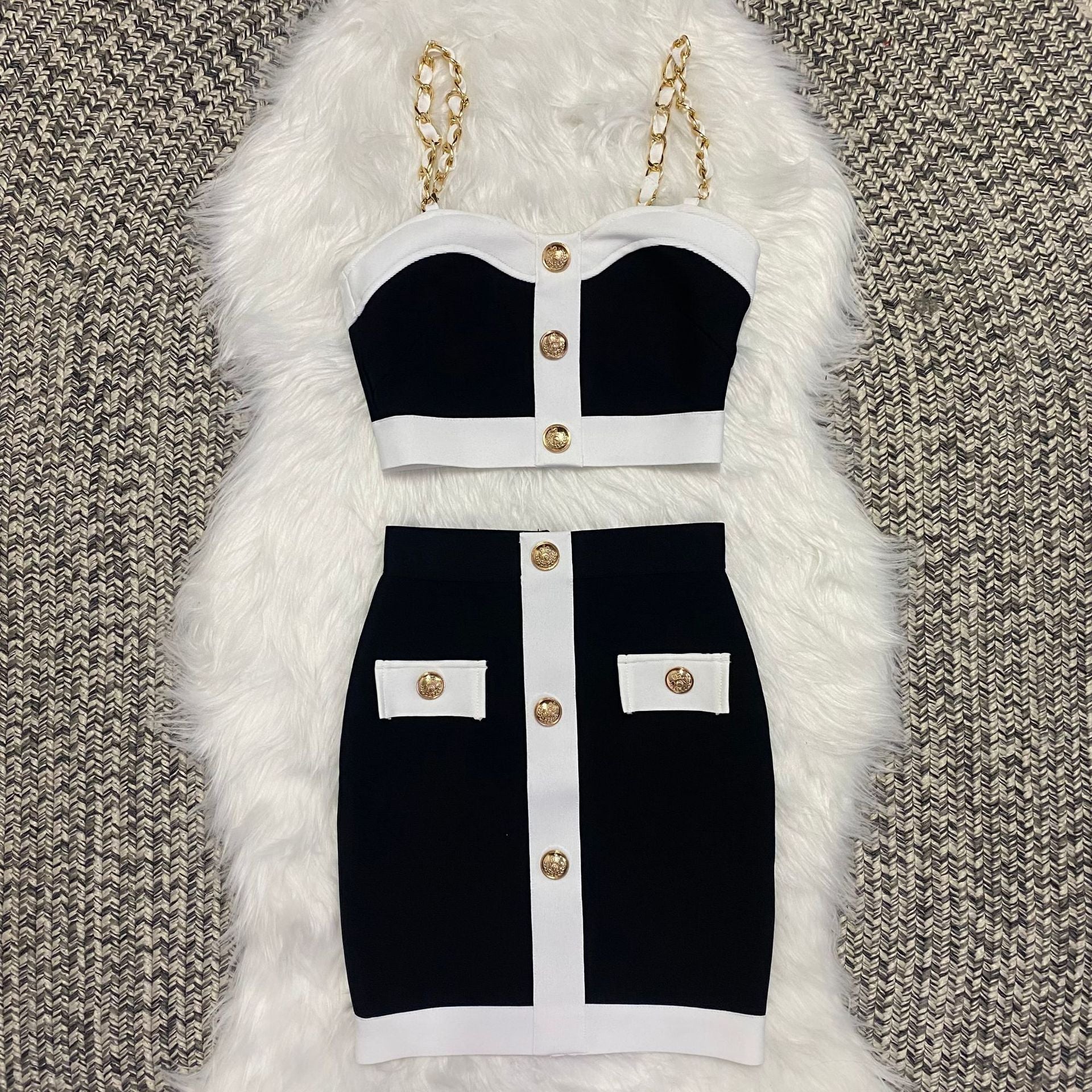 Black Sling Bandage Sexy Two-piece Suit Button Tight Nightclub Cocktail Dress Set