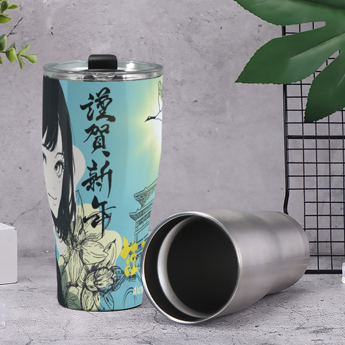 Cone Tumbler 30oz Japan, Japanese, Yellow, Blue, Day, Early Morning, Sunny Day, Crane, Architecture, Pretty Girl, Tiger, Kanji (Designed by Dunbi)