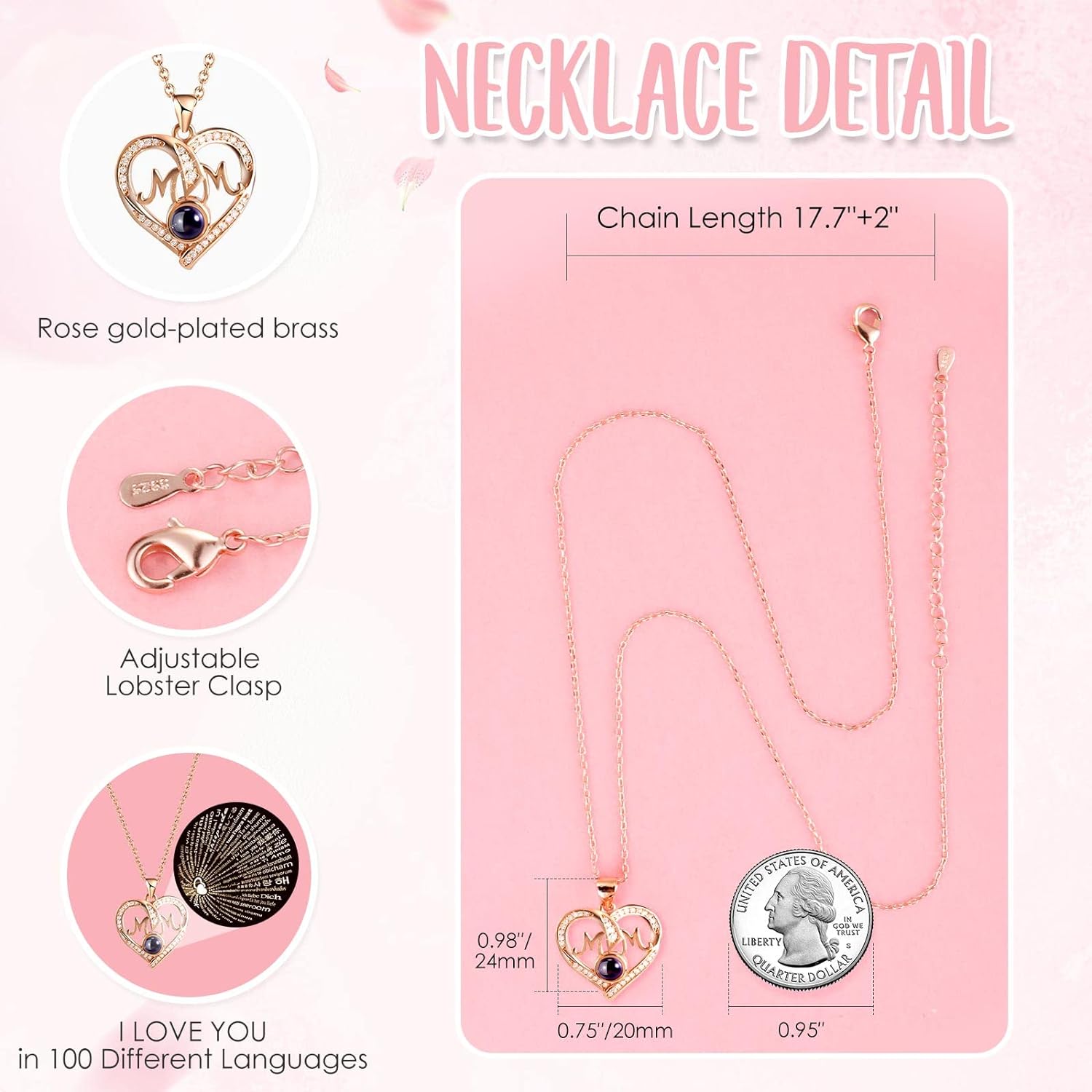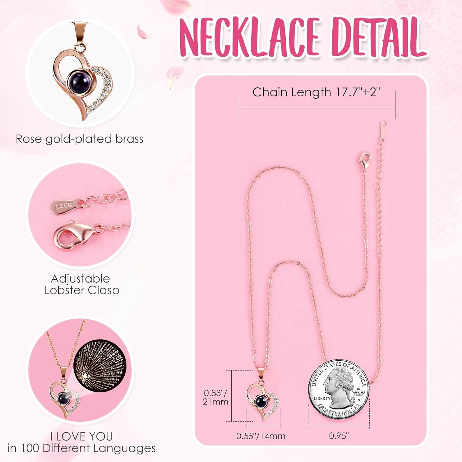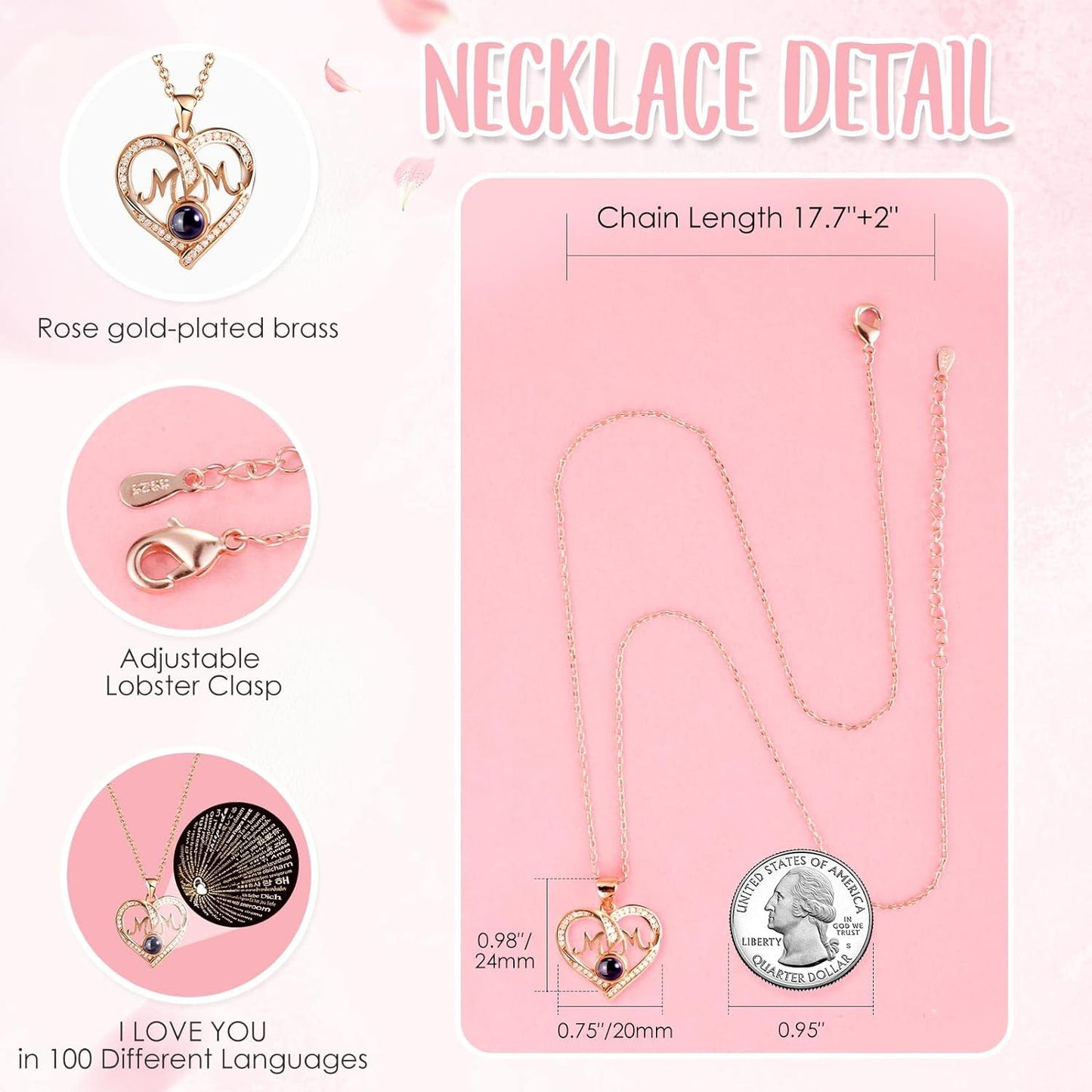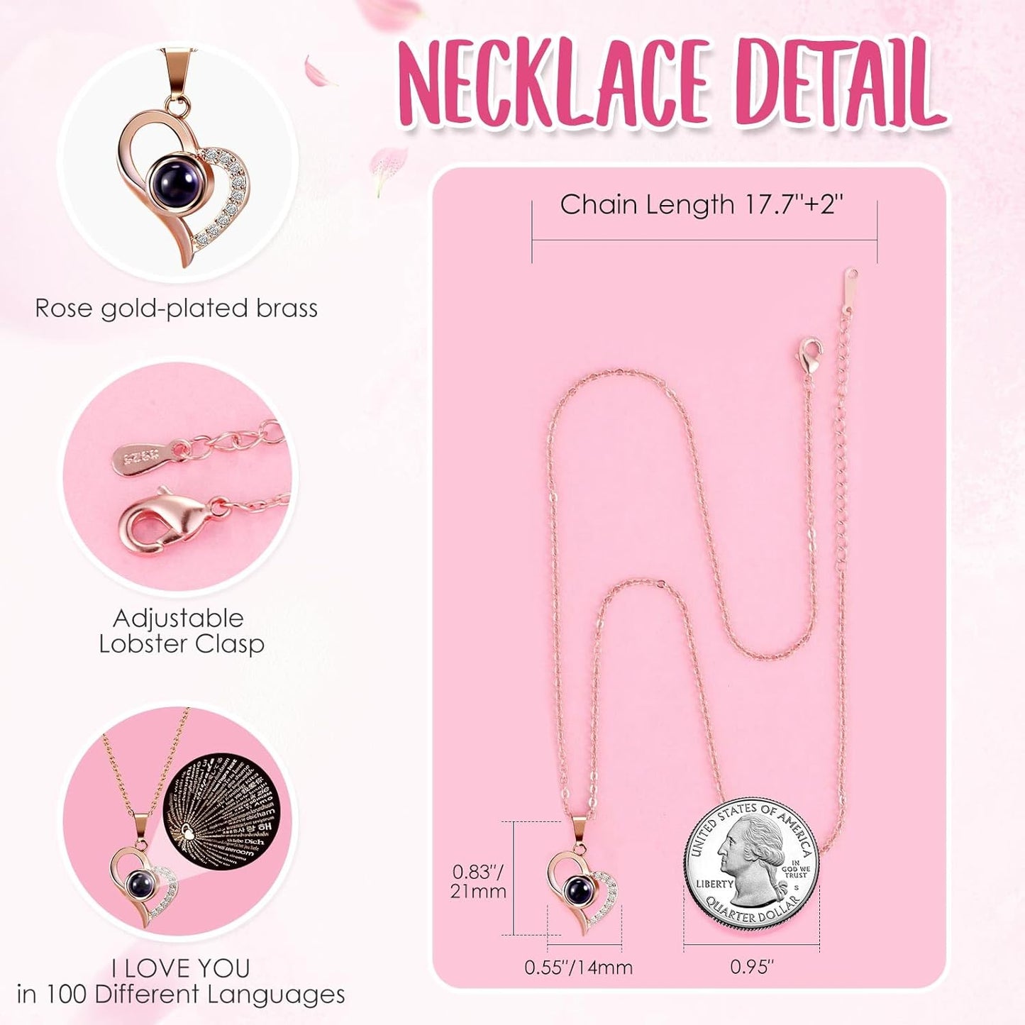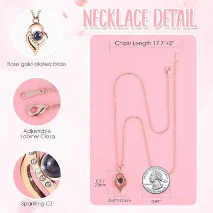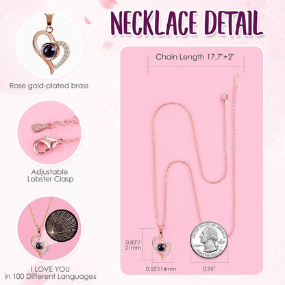 - ❤️ I LOVE YOU 100 Necklace: I LOVE YOU necklace 100 Languages in Hidden inside Bottom of the jewelry box, "which means there are 100 love you ways". The pendant and chain of mom necklace are made of brass with rose gold plating,which are hypoallergenic and have oxidation resistance.The love necklace designed with an 18-inch chain, 2-inch extender, and a adjustable spring ring clasp.They don’t contain lead, nickel, or allergens.