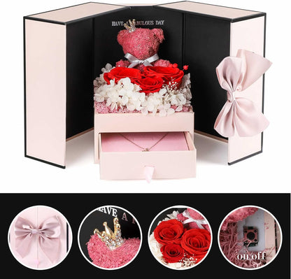 - 💐 Eternal Rose & Adorable Bear: This gorgeous heart-shaped arrangement features 3 preserved red real roses made from 100% fresh blooms. These roses have been preserved through a unique process, ensuring they will maintain their natural appearance for up to 3-5 years without any maintenance required. No need to worry about pollen or allergies either! And the cute, handmade moss bear with a sparkly crown adds a charming touch to the presentation.