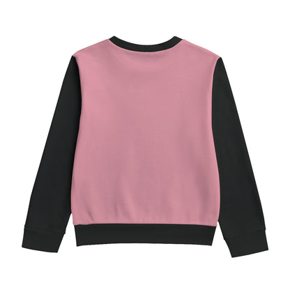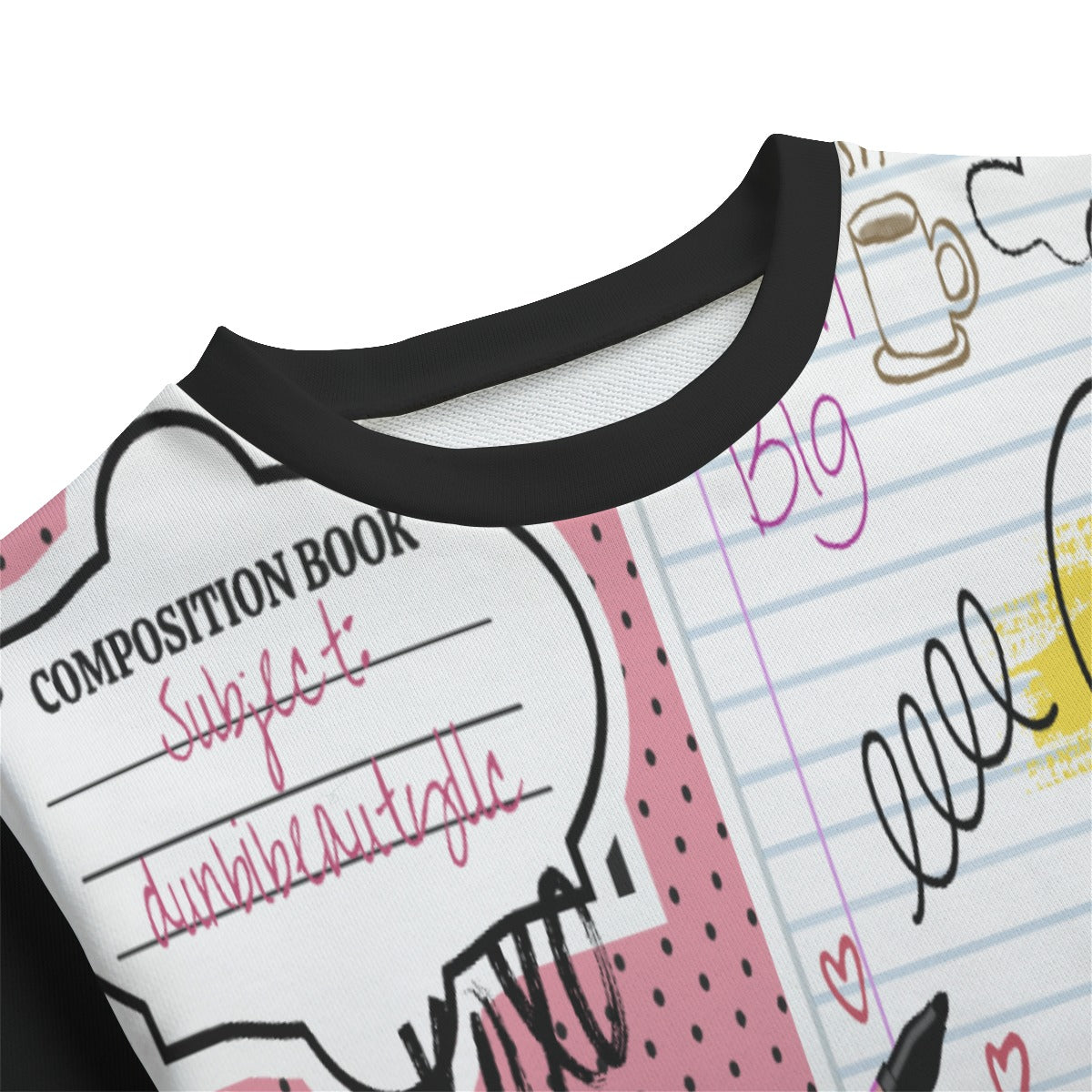 All-Over Print Kid's Round Neck Sweatshirt | 310GSM Cotton Back to School, Composition Notebook Style, Doodles, Scribbles, Writing, Girl, Pink (Designed by Dunbi)