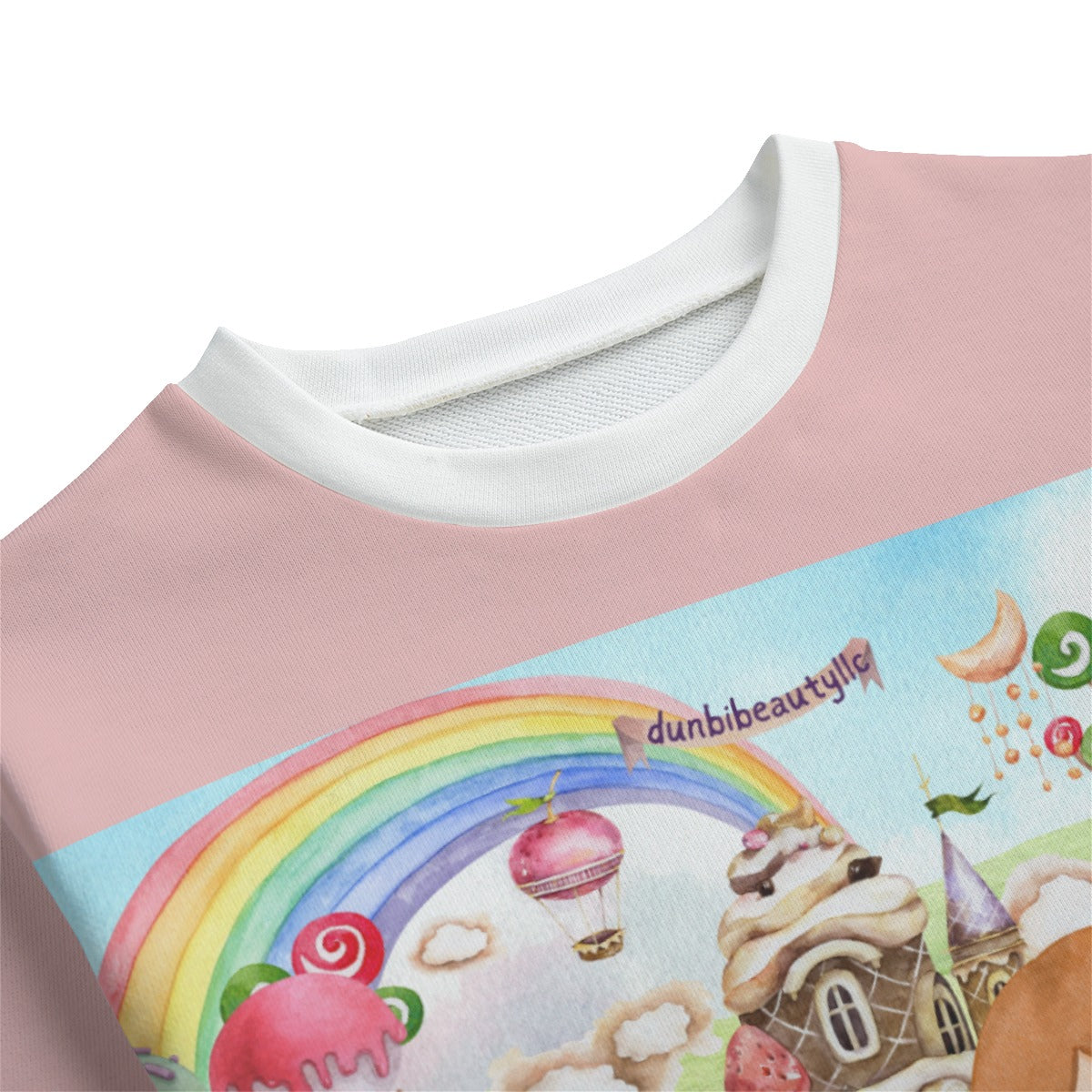 All-Over Print Kid's Round Neck Sweatshirt | 310GSM Cotton Watercolor, Candy, Pastel, Lollypops, Chocolate, Treats, Dessert, Girls, Friends, Rainbow, Candy Shop, Hot Air Balloon, Cake Pops, Chocolate Clouds (Designed by Dunbi)