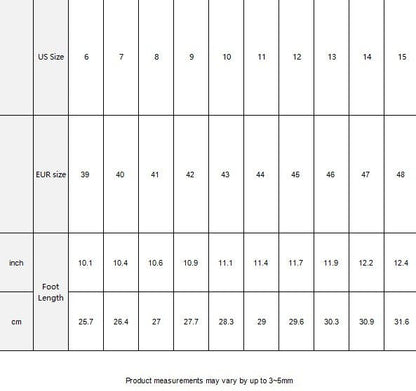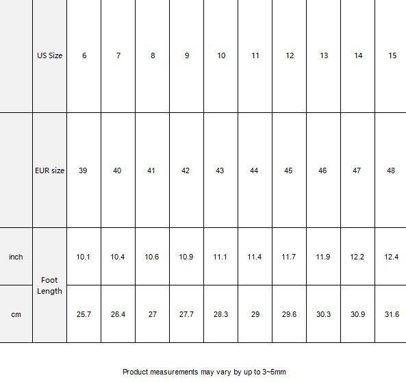 | US Size | 6 | 7 | 8 | 9 | 10 | 11 | 12 | 13 | 14 | 15 | |