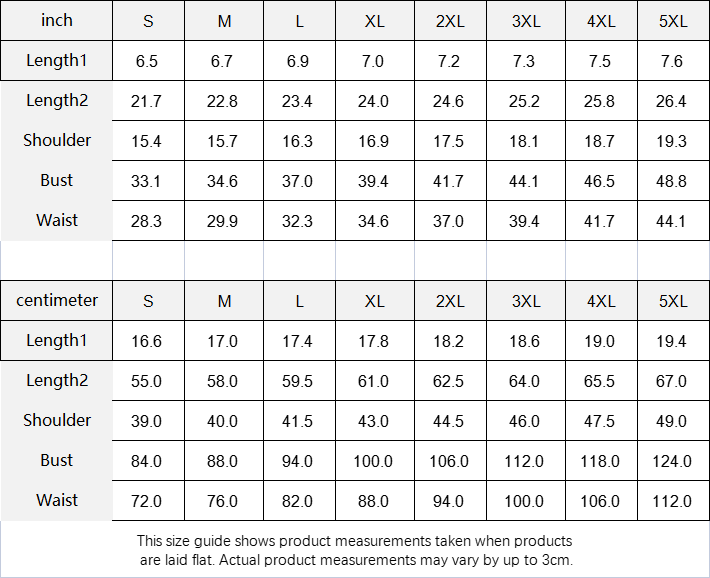 | centimeter | S | M | L | XL | 2XL | 3XL | 4XL | 5XL |