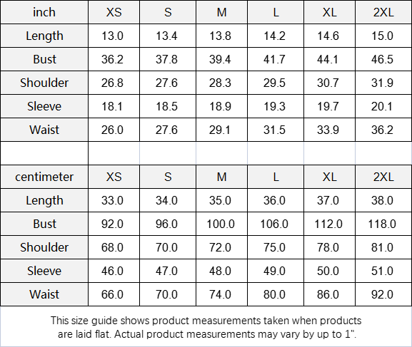 This size guide shows product measurements taken when products are laid flat. Actual product measurements may vary by up to 3cm.