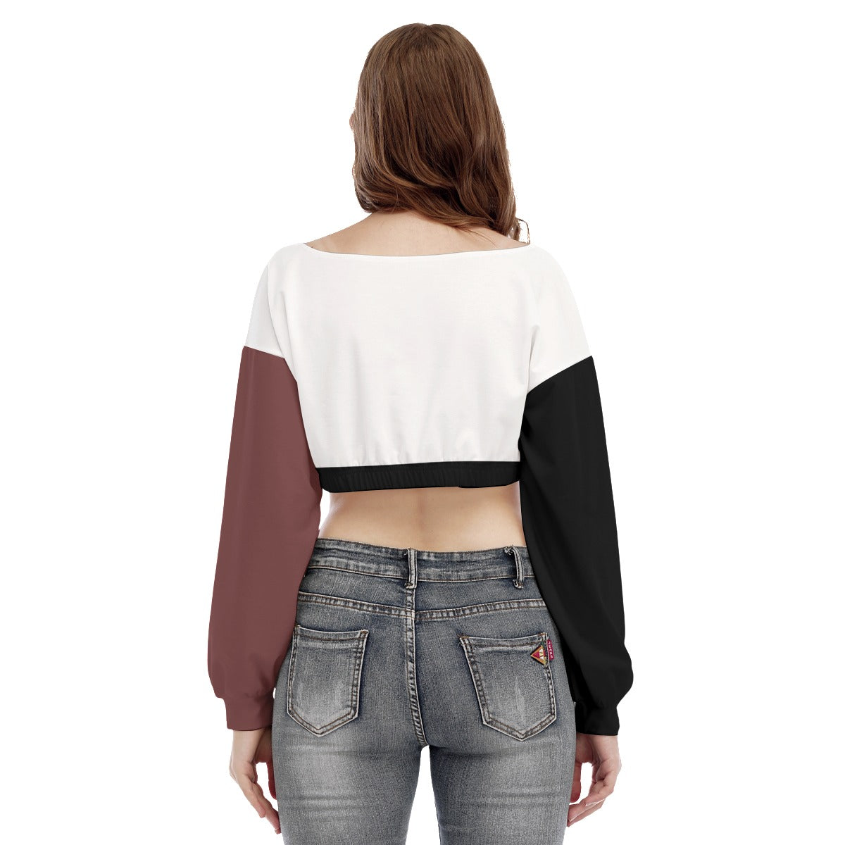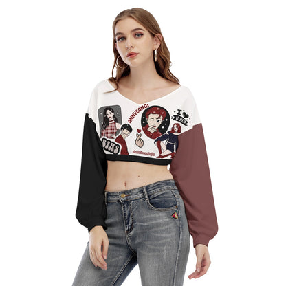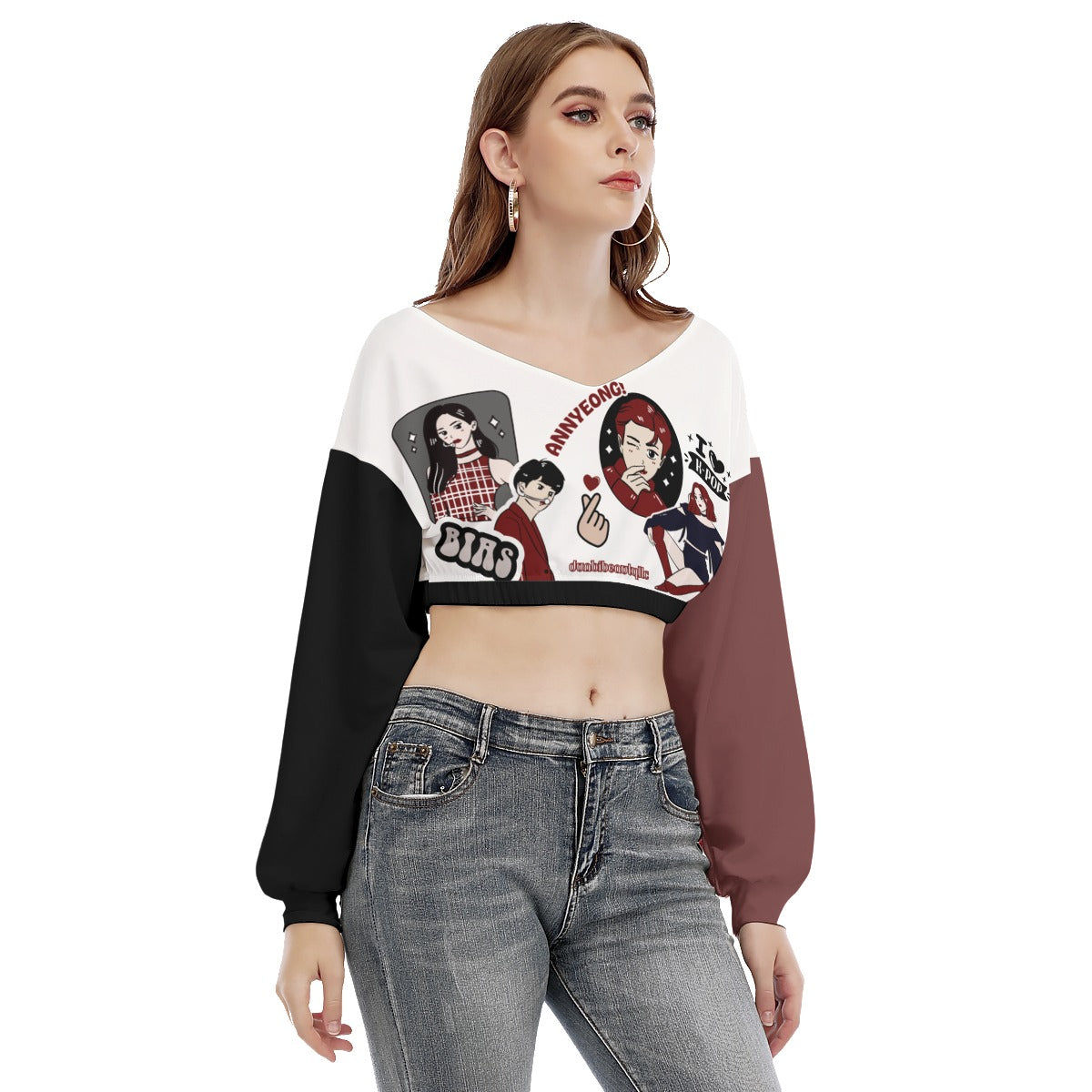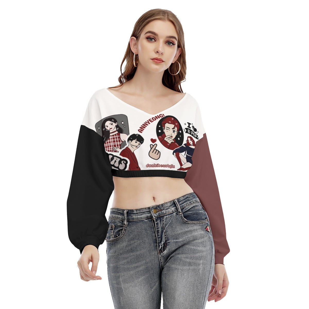 All-Over Print Women's V-neck Long Sleeve Cropped Sweatshirt Kpop Inspired, Itzy, BTS, BLACKPINK, Annyeong, Bias, I Love Kpop, Marble, Black and Red, Idol Ryujin, Jin (Designed by Dunbi)