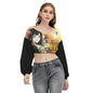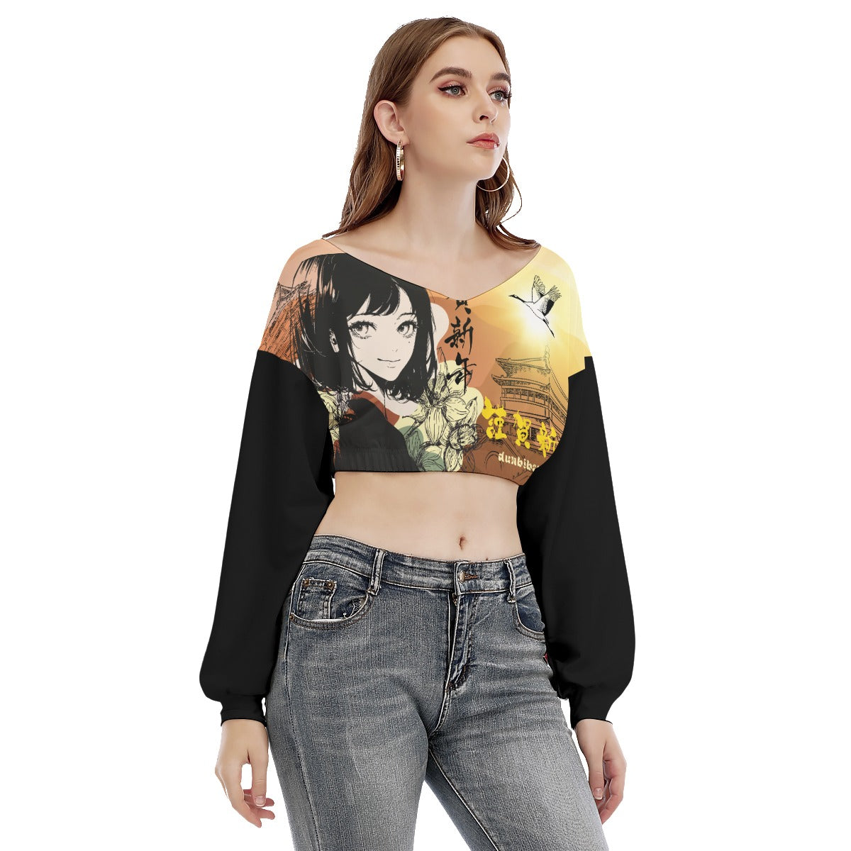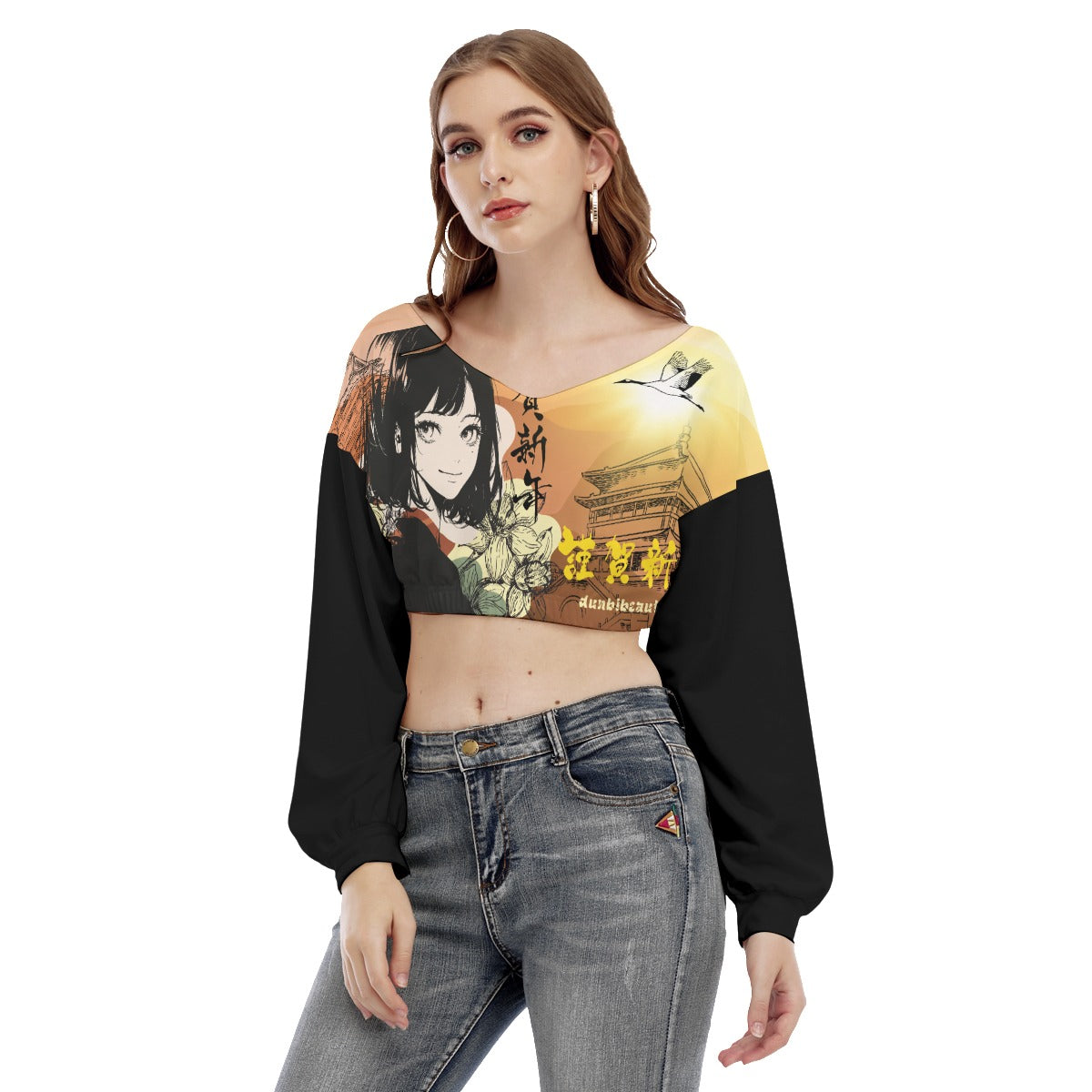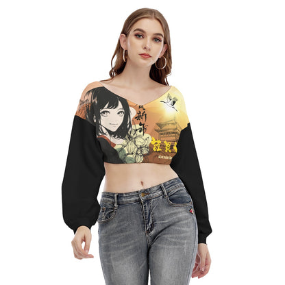 All-Over Print Women's V-neck Long Sleeve Cropped Sweatshirt Japan, Japanese, Red, Crane, Architecture, Pretty Girl, Tiger, Kanji, Sunrise (Designed by Dunbi)