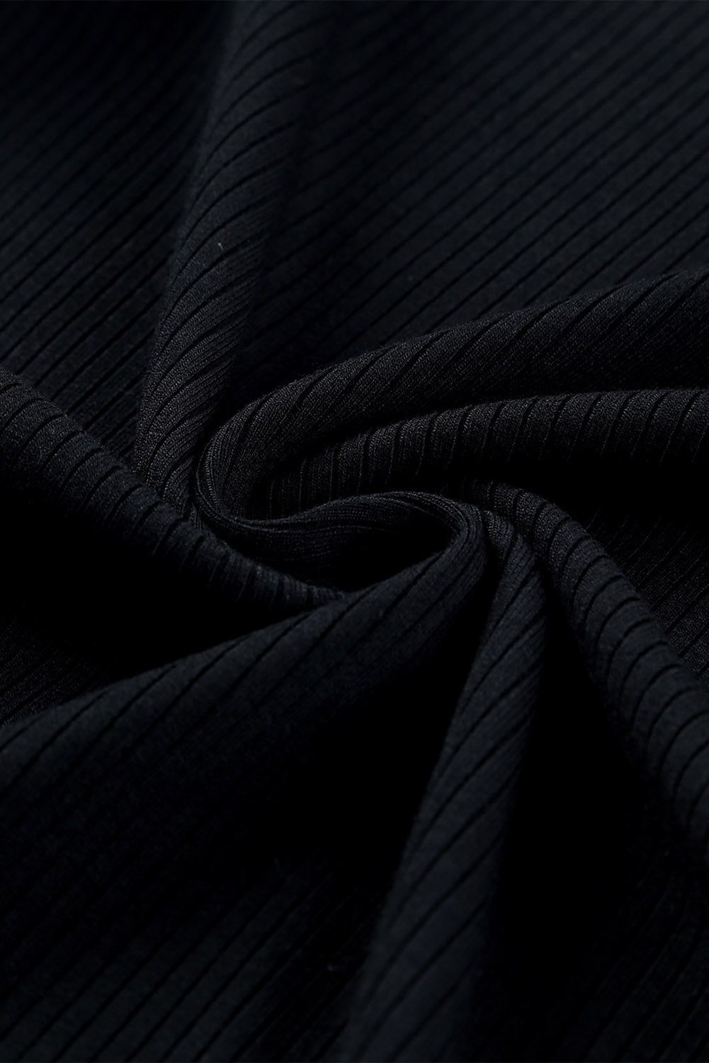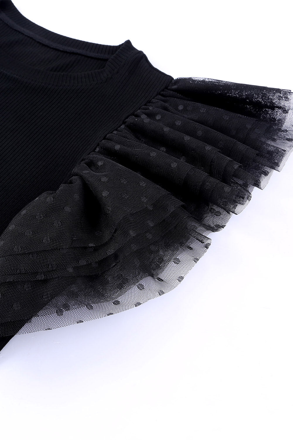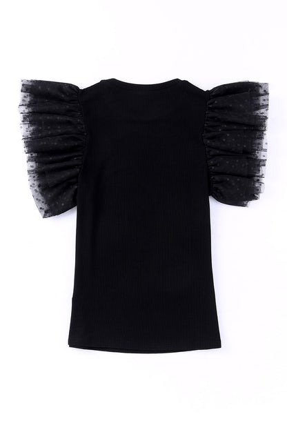 Black Dotty Mesh Ruffle Sleeve Ribbed Knit Top