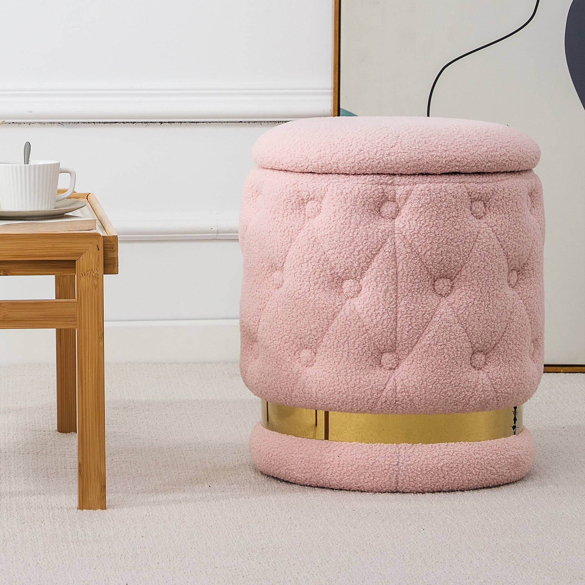 Chair Pink Round-shape Teddy velvet Makeup Stool Footstool, chair with storage space .Applicable to living room dresser kitchen bedroom dining room