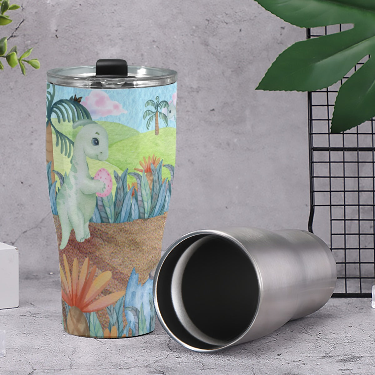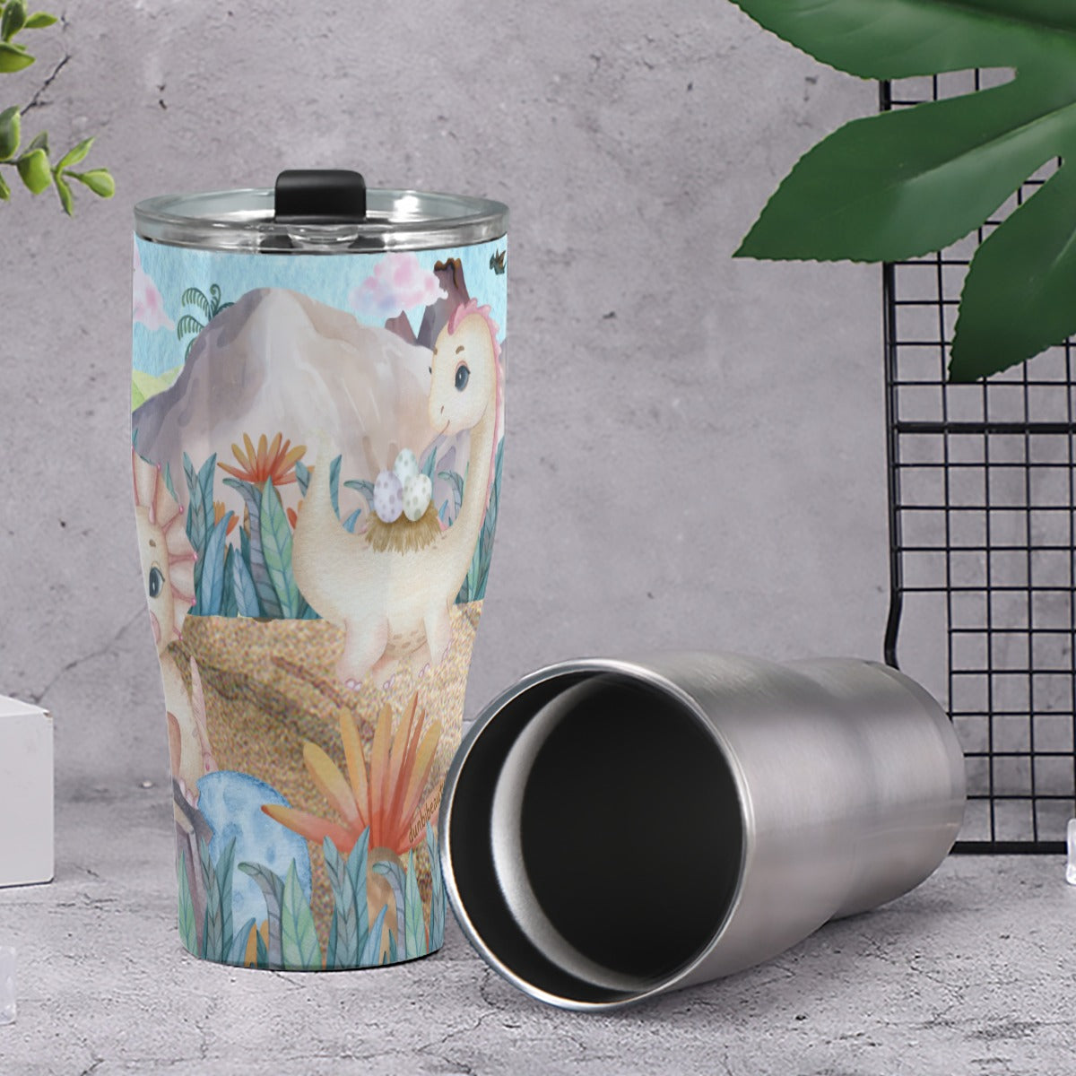 Cone Tumbler 30oz Watercolor Dinosaurs, Volcano, Grass, Dino Eggs, Cute, Triceratops. Parasaurolophus, Pterodactyl, Diplodocus, Prehistoric (Designed by Dunbi)