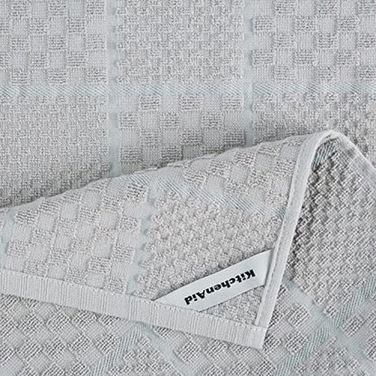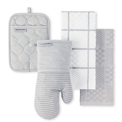 Details: Get kitchen tasks done with the help of the KitchenAid Onion Quilt 4-Pack in Matte Grey. This set includes two terry dobby kitchen towels, a pot holder, and an oven mitt, all with a combination of a modern solid and trellis design. The oven mitt and pot holder offer heat protection while handling hot pots, pans, dishes, and cookware. The kitchen towels are soft and absorbent. This set is machine washable for easy care.