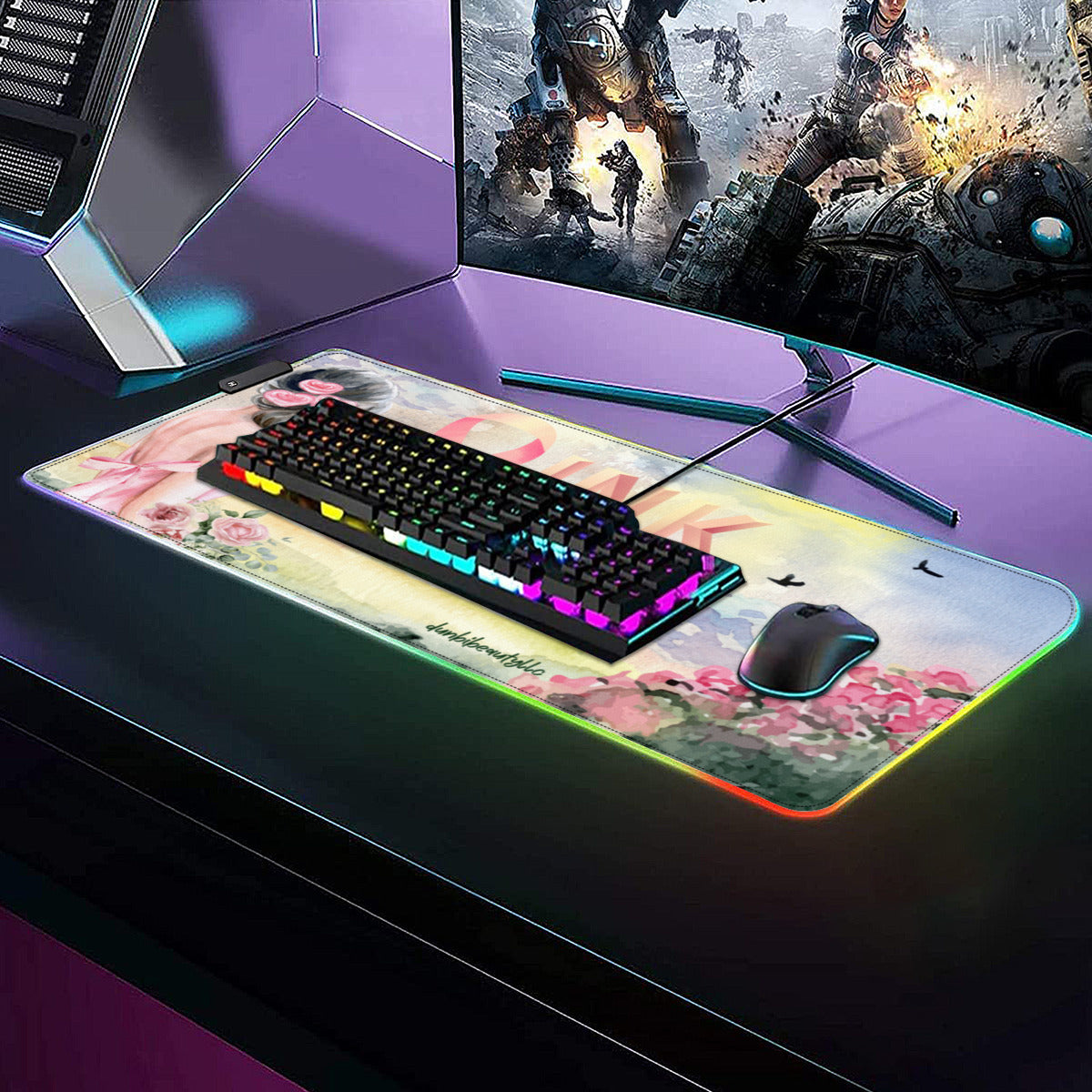 Multi-Interface Lighted Mouse Pad|Rubber -Pastel Pink, Breast Cancer Awareness, Open Field, Day, Birds, Flowers, Bows and Ribbons, Watercolor Sunlight (Designed by Dunbi)