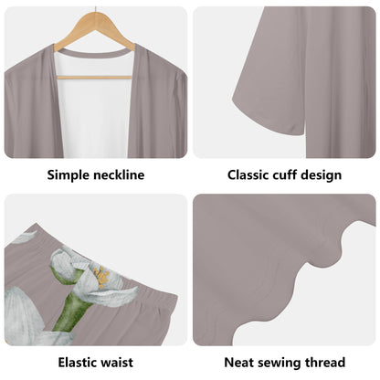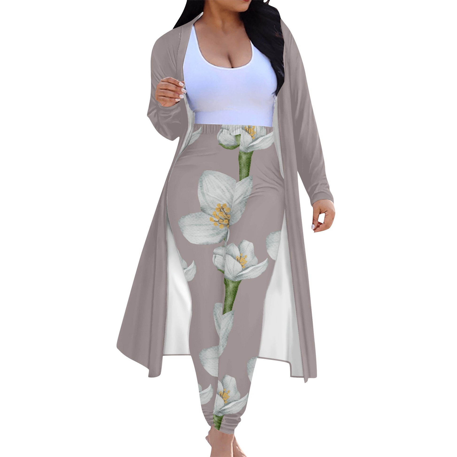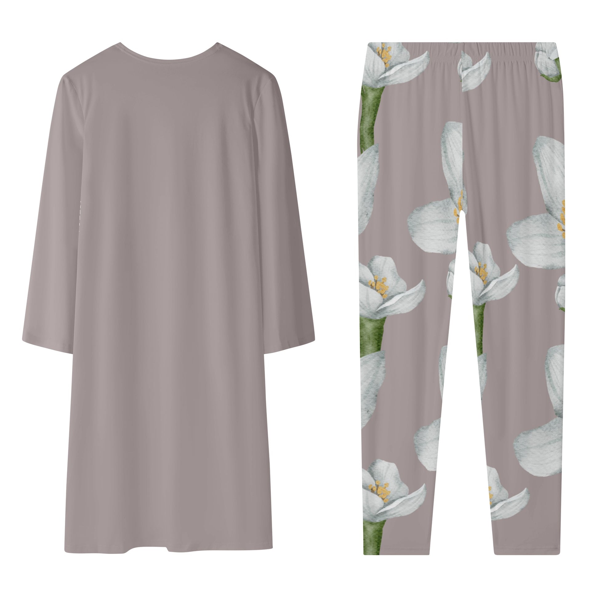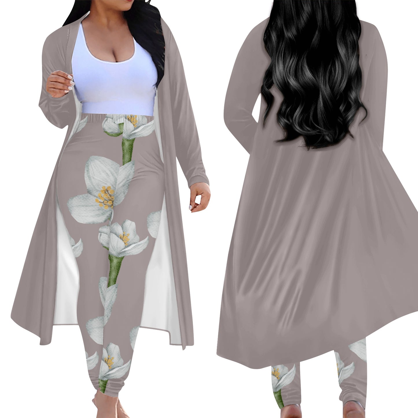 Women's Long Sleeve Cardigan and Leggings 2pcs Taupe with Gray Watercolor Flowers (Designed by Dunbi)
