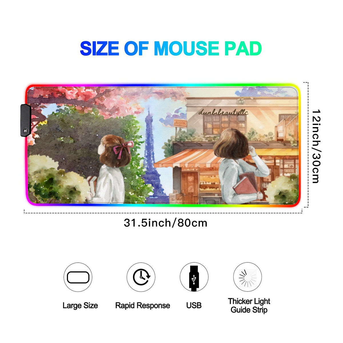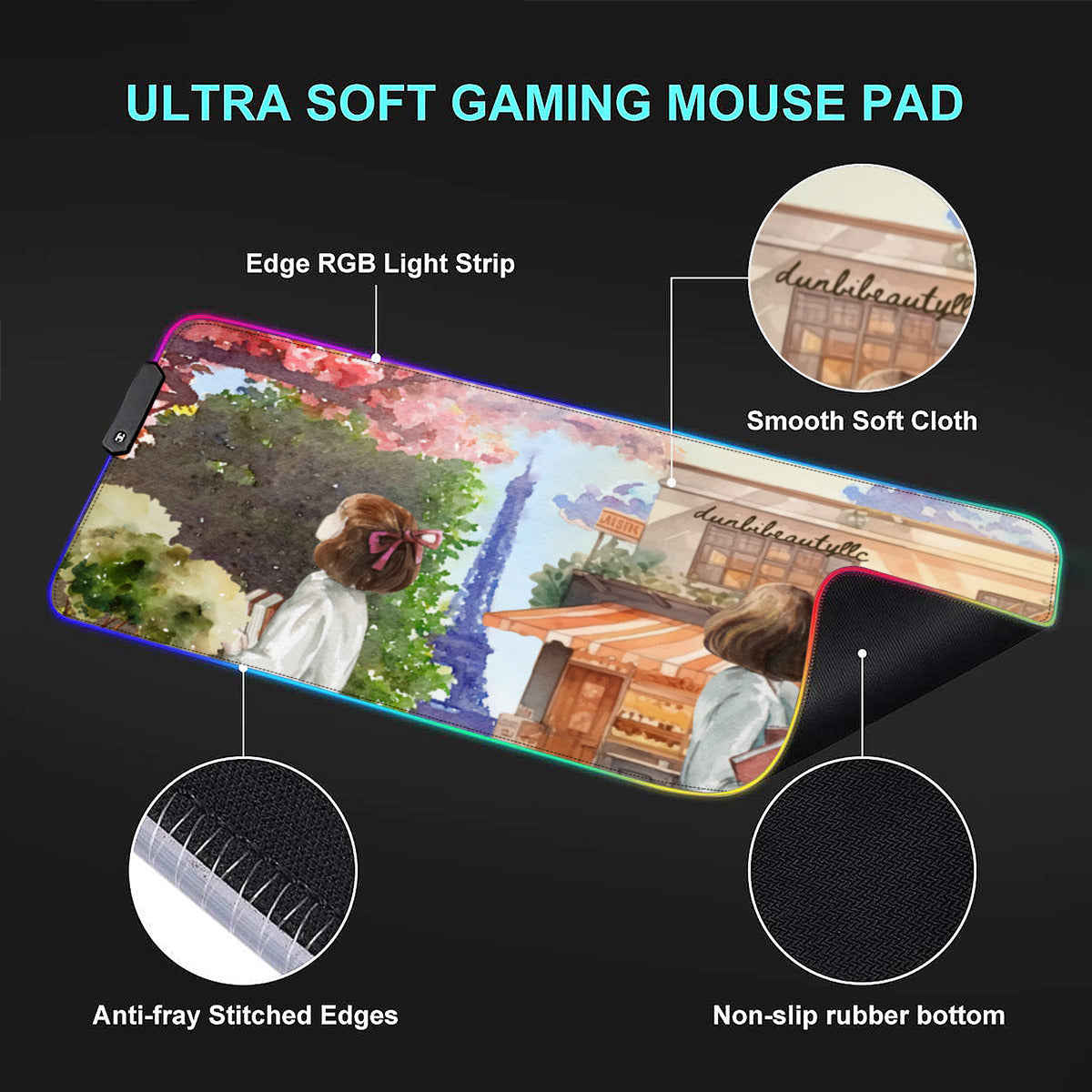 Multi-Interface Lighted Mouse Pad|Rubber - Paris, France, Eiffel Tower, Watercolor, Girls, Notebook, Café, View, Day, Clouds, Cute (Designed by Dunbi)