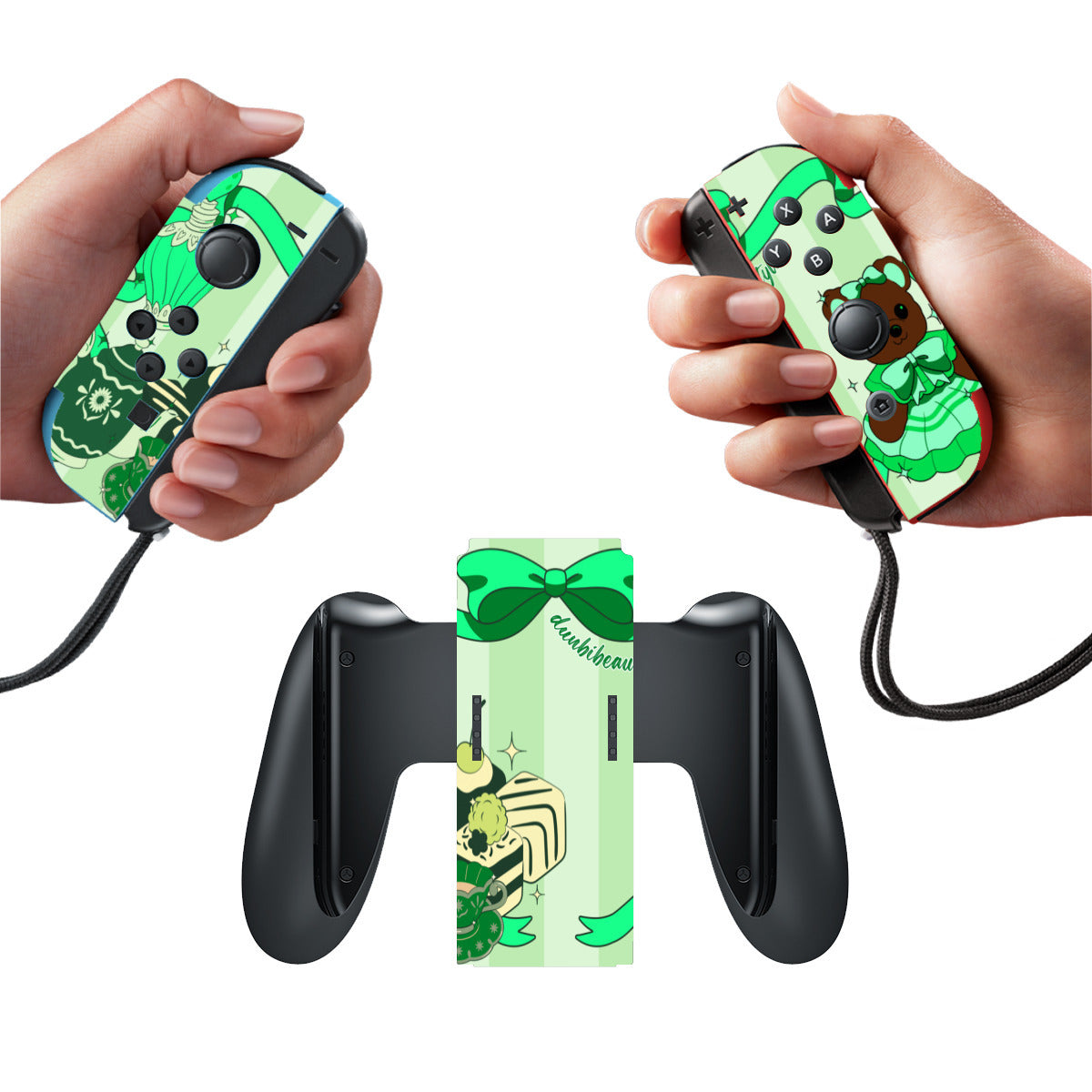 Nintendo Switch Game Console Stickers |PVC - Cute Teddy Bear, Tea Party, Ribbon, Bows, Cakes, Cute, Victorian, Doll, Cute Girl, Green Style 1, Stripes (Designed by Dunbi)