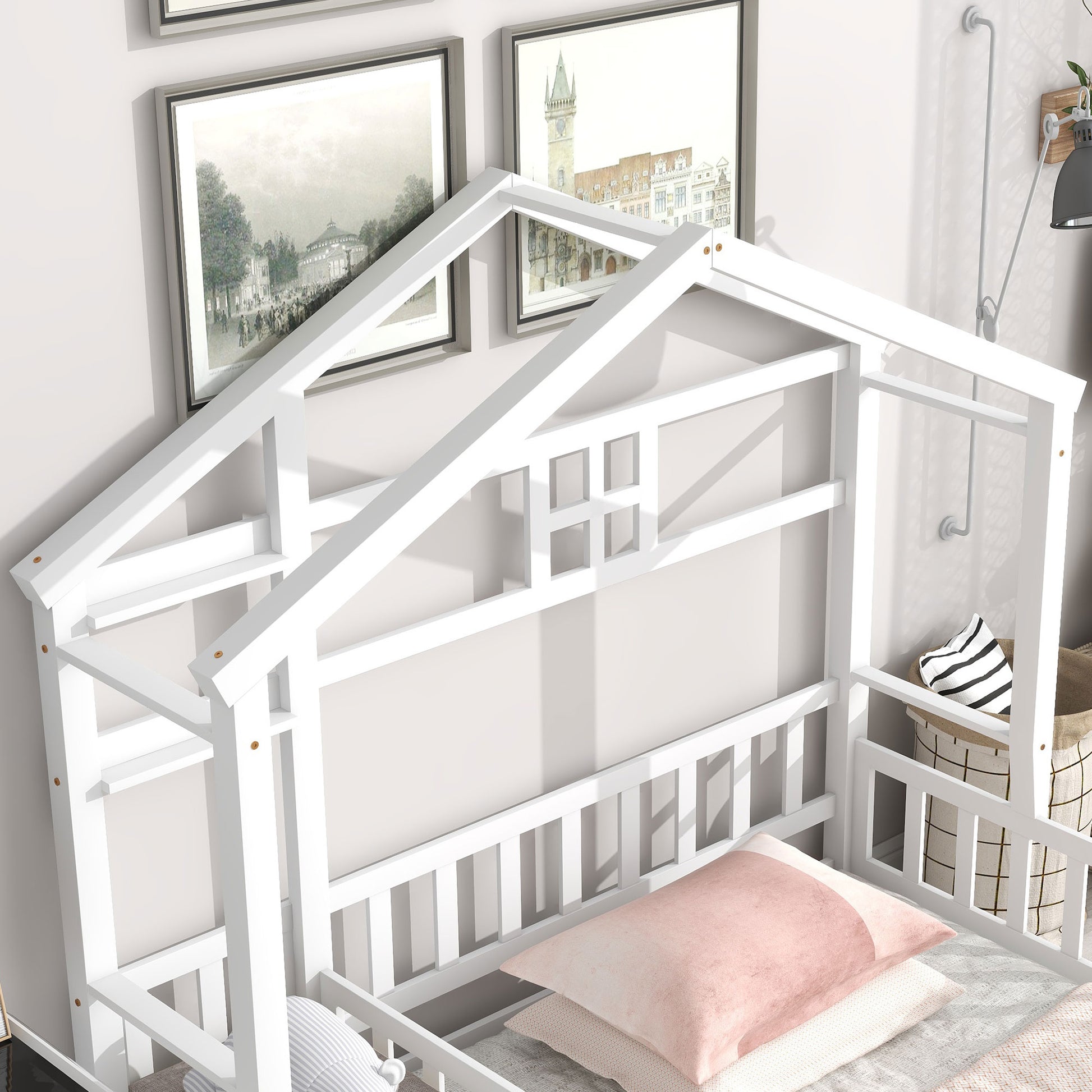 Twin Size House-Style Headboard Floor Bed with Fence Guardrails, Cushion Stand ,White